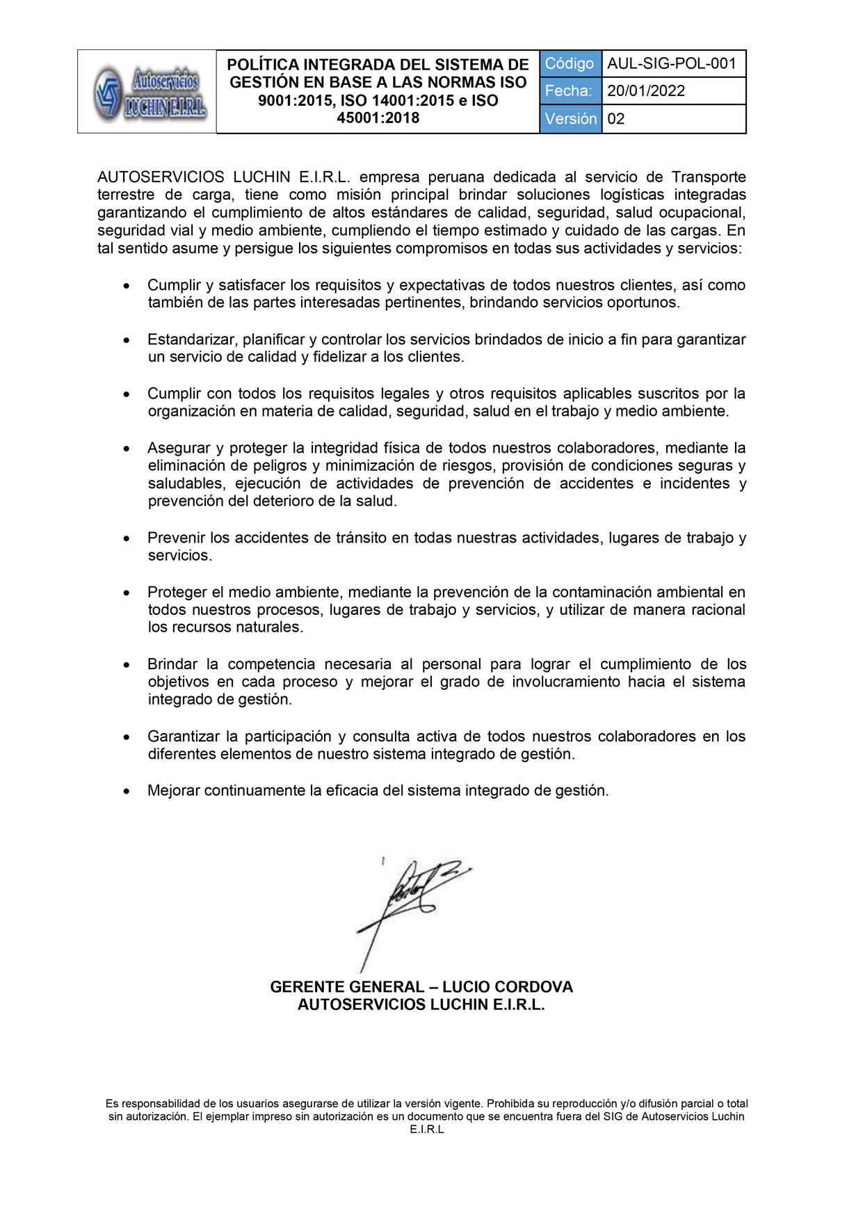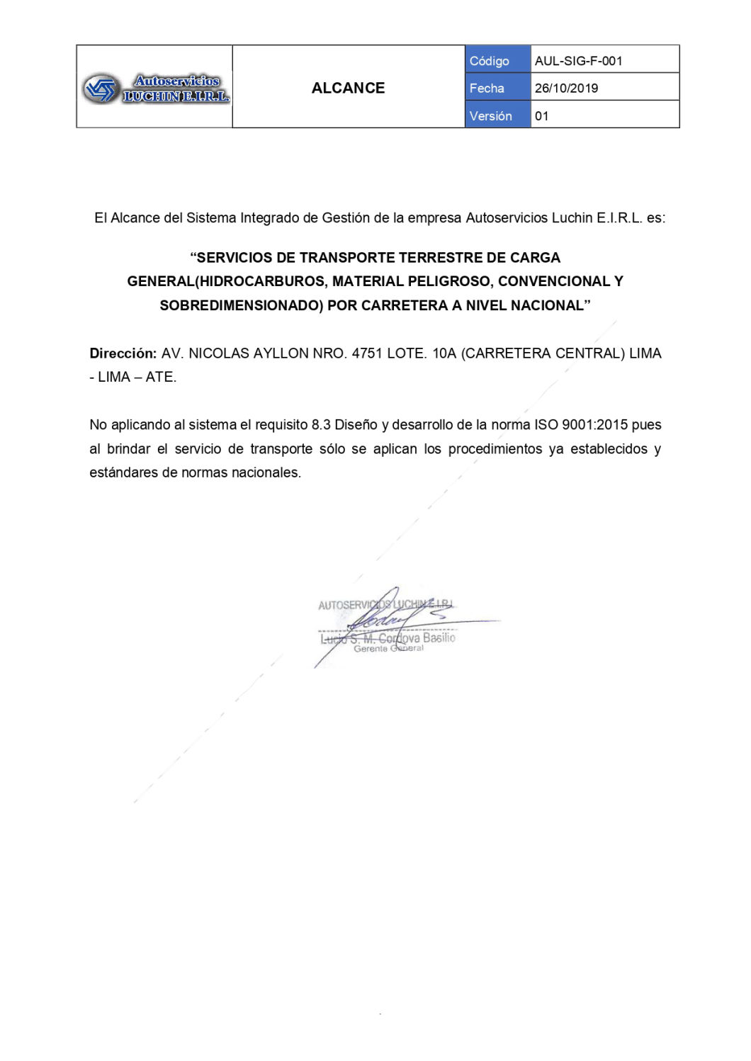 AUTOSERVICIOS LUCHIN E.I.R.L. ha formado parte del mercado laboral como una empresa transportista de excelencia, ahora lo viene garantizando gracias a la obtención de tres certificados normativos con estándares internacionales, mediante un sistema integrado de gestión los cuales son: Sistema de Gestión de Calidad, Medio ambiente y Seguridad y Salud en el trabajo en base a las normas ISO 9001:2015, ISO 14001:2015 e ISO 45001:2018, y todo ha sido posible gracias al cofinanciamiento del Programa nacional Innóvate Perú para la Competitividad y Productividad (Innóvate Perú) del Ministerio de la Producción.